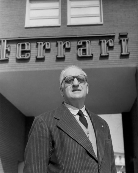 - Enzo Ferrari at the entrance of the Ferrari Factory, 1957